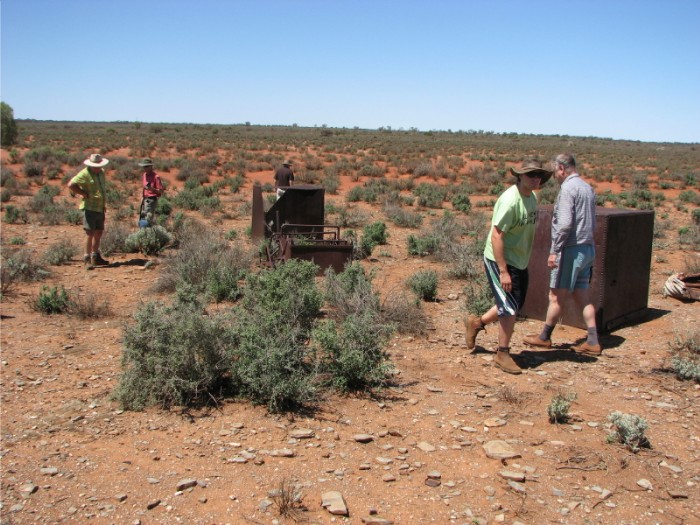 We then interpreted a third location from written information we had available but still had no success in locating it. Although we weren’t successful we gave it a red hot go. Joe walked a considerable distance east of our discussion point. Peter Bridge and I walked a similar distance south and found an extensive outcropping of slate. I returned to pick up Rob and Clinton and then drove cross country to where Peter was further exploring the slate outcrop. Phil and Joe arrived in the Toyota, having found a track that led almost to the spot. The area was thoroughly searched but no well was found. We did, however, come across a rusting horse drawn scoop and some water condenser tanks.