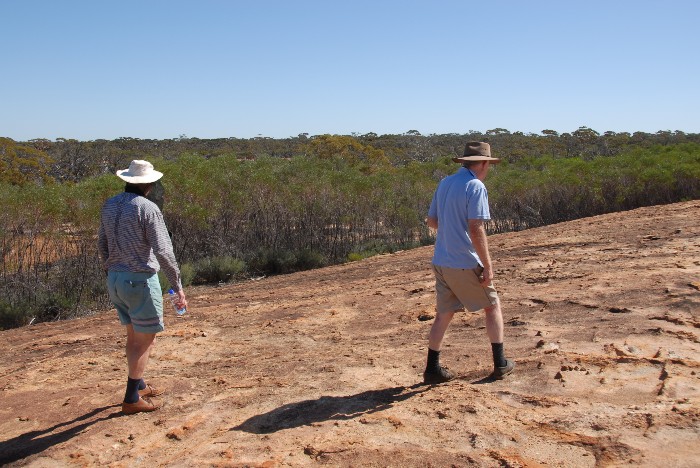 Returning to the Esperance Road we crossed to the east and after much calculation and interpreting of information available, I set off with Clinton, Joe and Rob, looking for Depot Hill/Rock. It is 424 metres high, some five acres in extent and is located at 31 09.841S, 121 25.889E (datum WGS84).