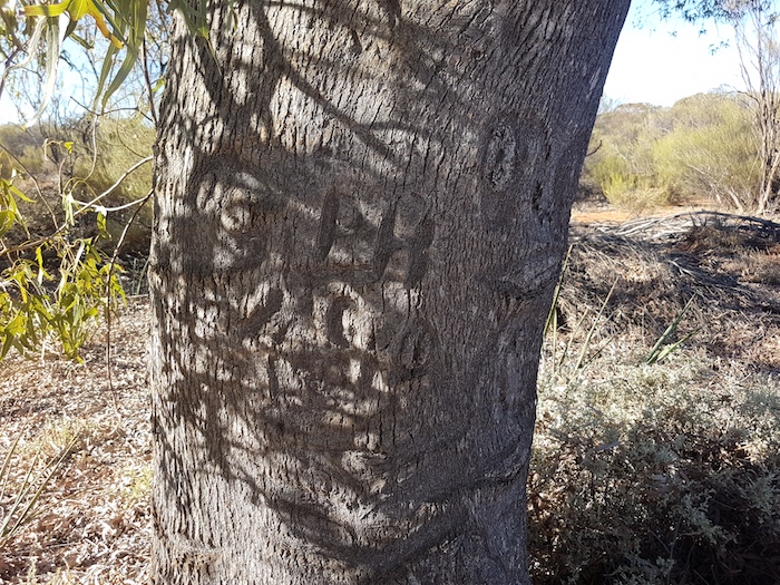 Six kilometres along the Track, on the left, is a blazed kurrajong tree. This is reasonably easy to spot as it is the only kurrajong tree in the vicinity. The initials and year of the blaze can’t be determined.