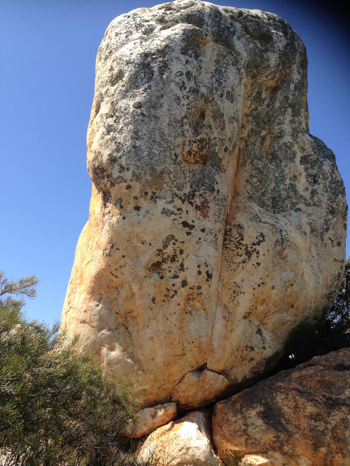 White Man Rock Well at Moujakine, 11 kilometres north-east of Trayning. There are a number of directional signs to White Man Rock but none that mark the actual entry to the Rock. One hopes that the Shire of Trayning will one day rectify that deficiency.