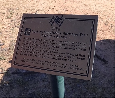 Both Karolin Rock and Carolling Rocks are in the Shire of Yilgarn, which made coordination of the relocation of the plaque hassle free. However, the plaque was not moved to current day Carolling Rocks. The rock Hunt referred to as Carolling/Karolling in 1865-66 is actually current day Karalee Rock. However, the name Karalee wasn’t used until 1890 when recorded by surveyor N.M. Brazier.